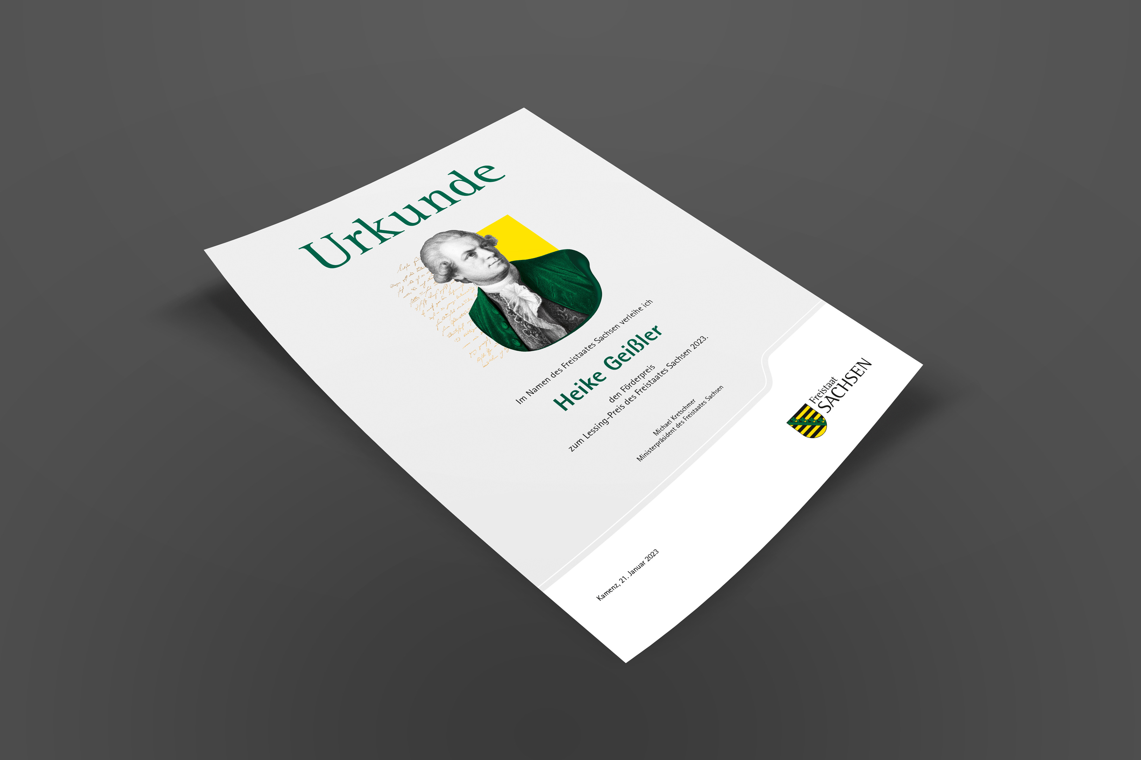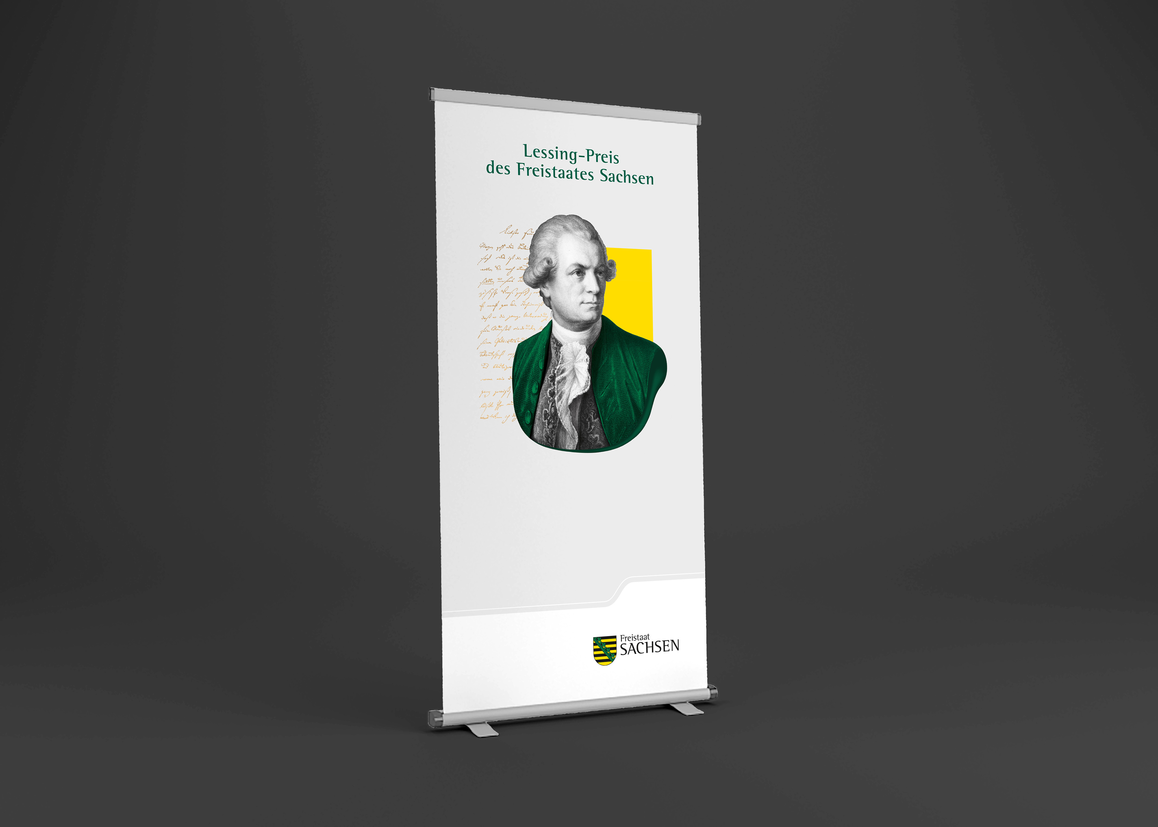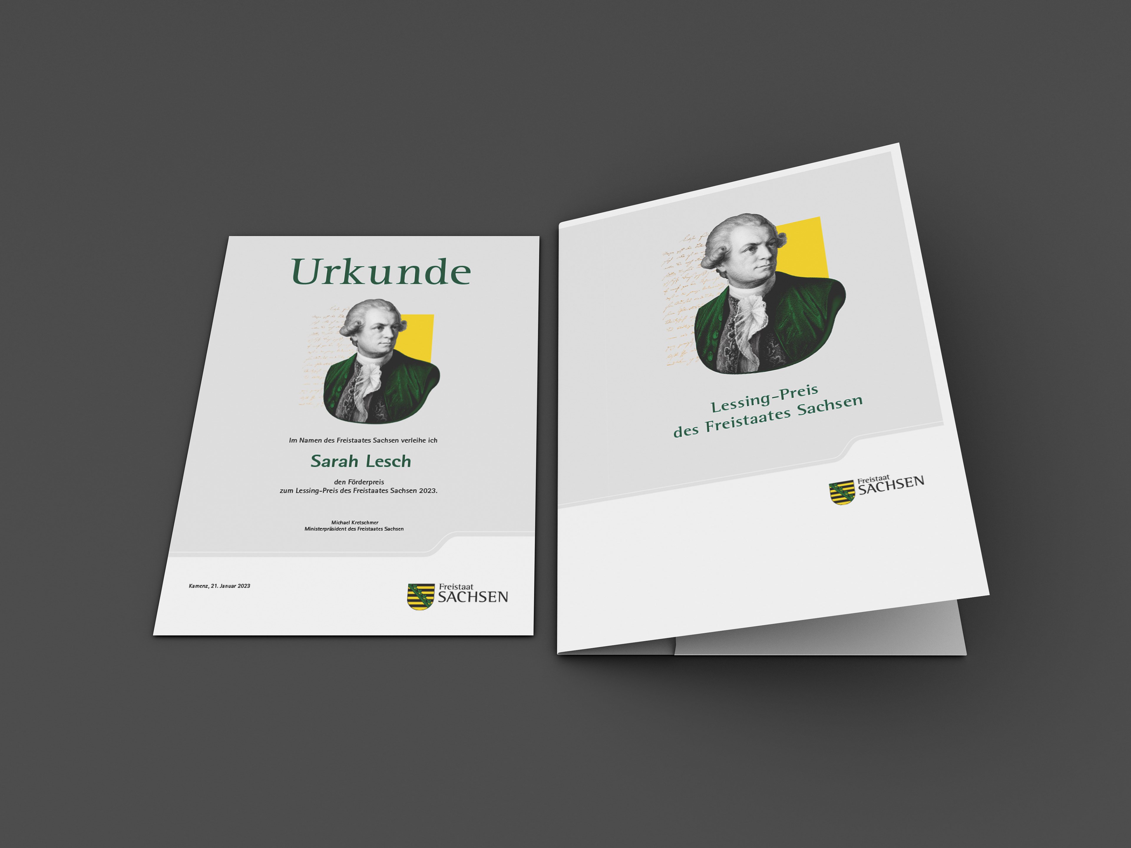 It should have a clear reference to Lessing and use the colors of the corporate design of the Free State of Saxony.