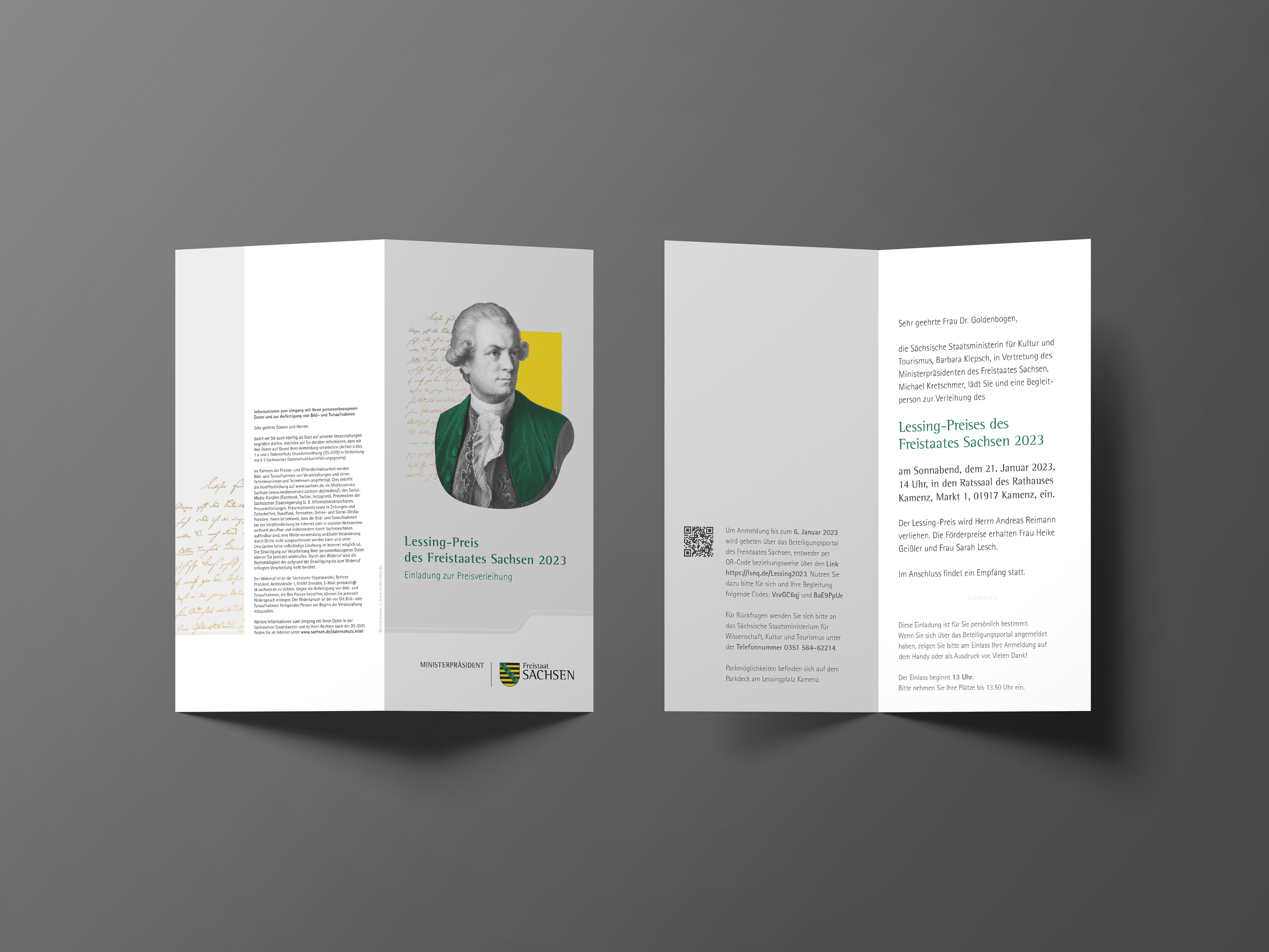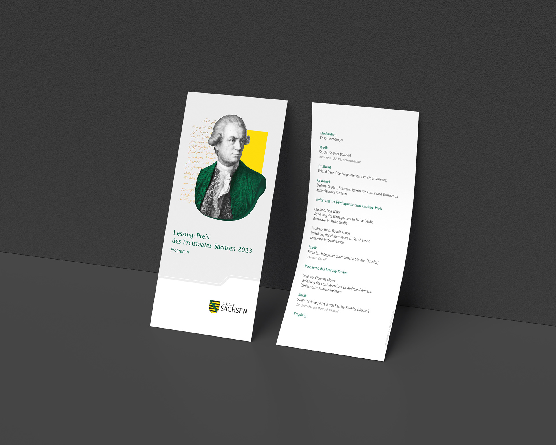The Lessing Award of the Free State of Saxony is awarded bi-annually as part of the Kamenz Lessing Days and honors outstanding contributions in the spirit of Lessing in areas such as literature and theater. The aim for the award ceremony on January 21, 2023 the client was to develop a timeless motif for the key visual, which could be used for various purposes throughout the event equipment.